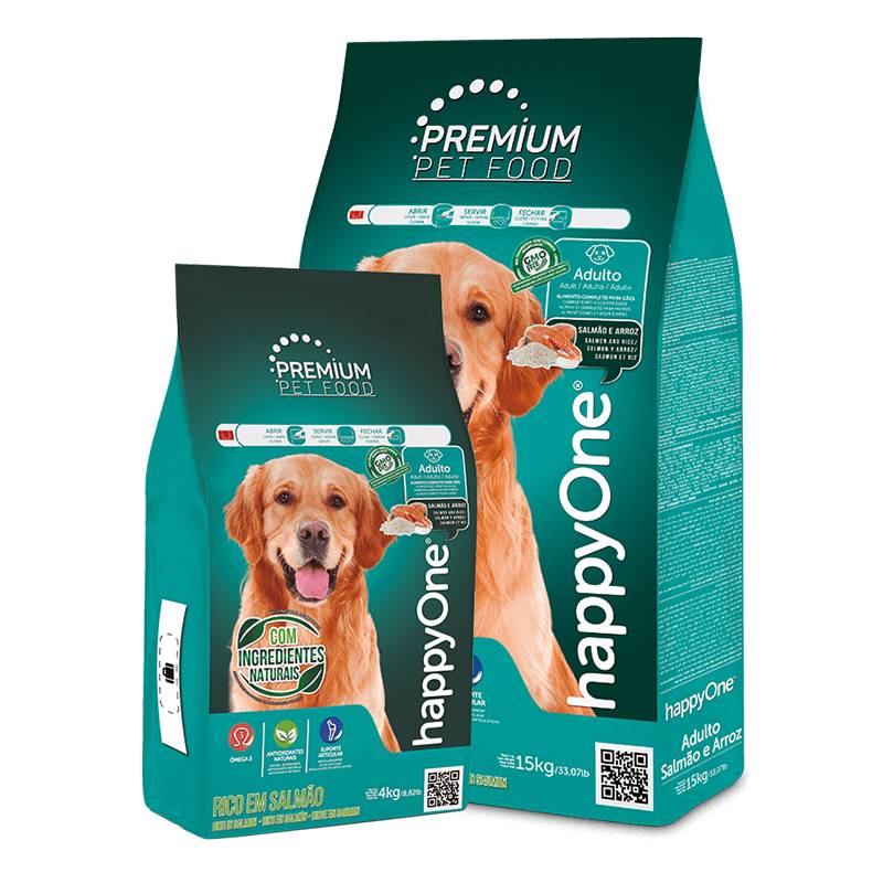 HappyOne Adult Dog with Salmon and Rice - არის პრემიუმ კლასის საკვები ორაგულითა და ბრინჯით, რომლის გამოყენებაც შესაძლებელია ყველა ჯიშის ძაღლისთვის.
