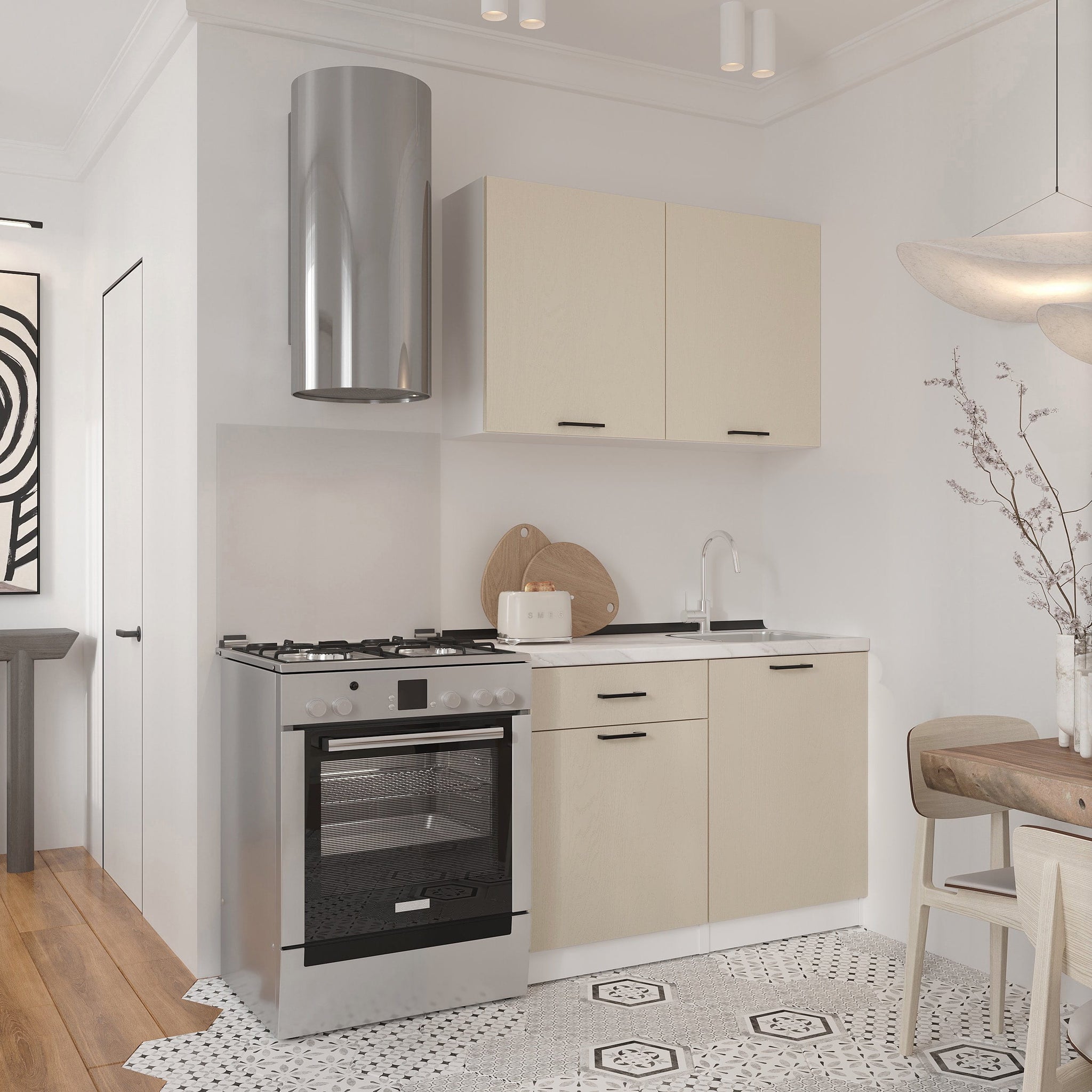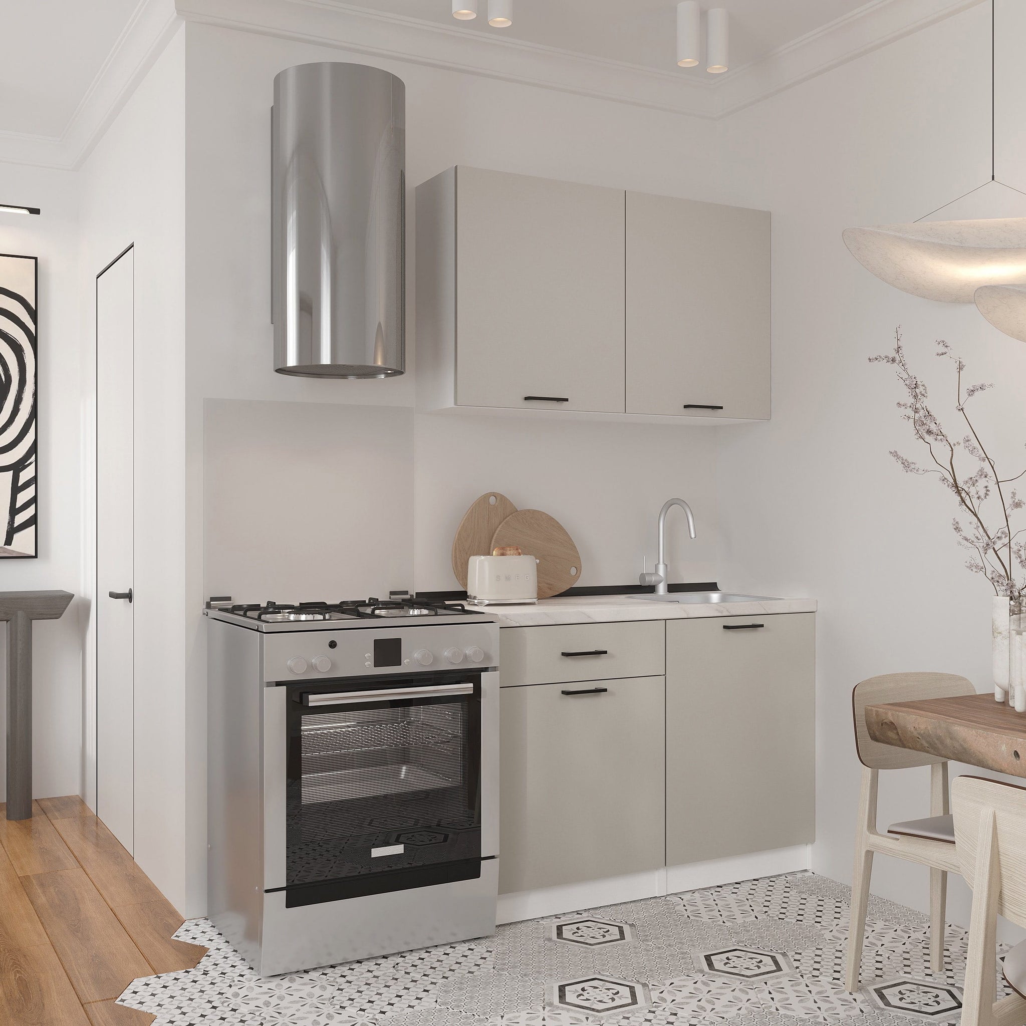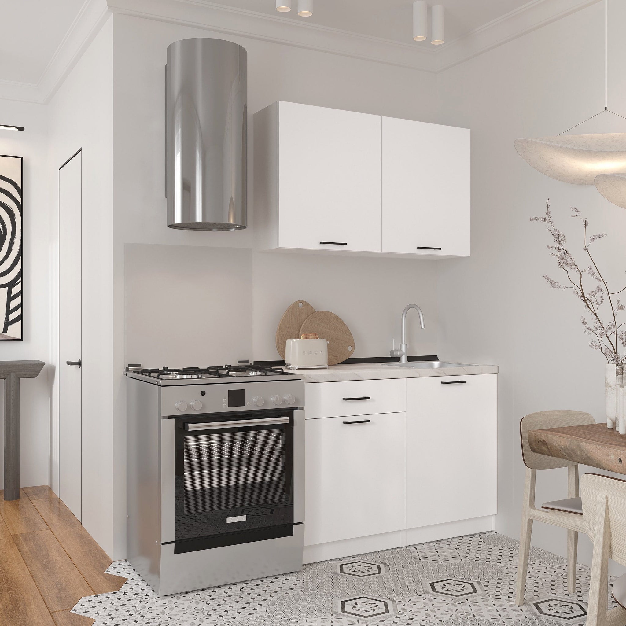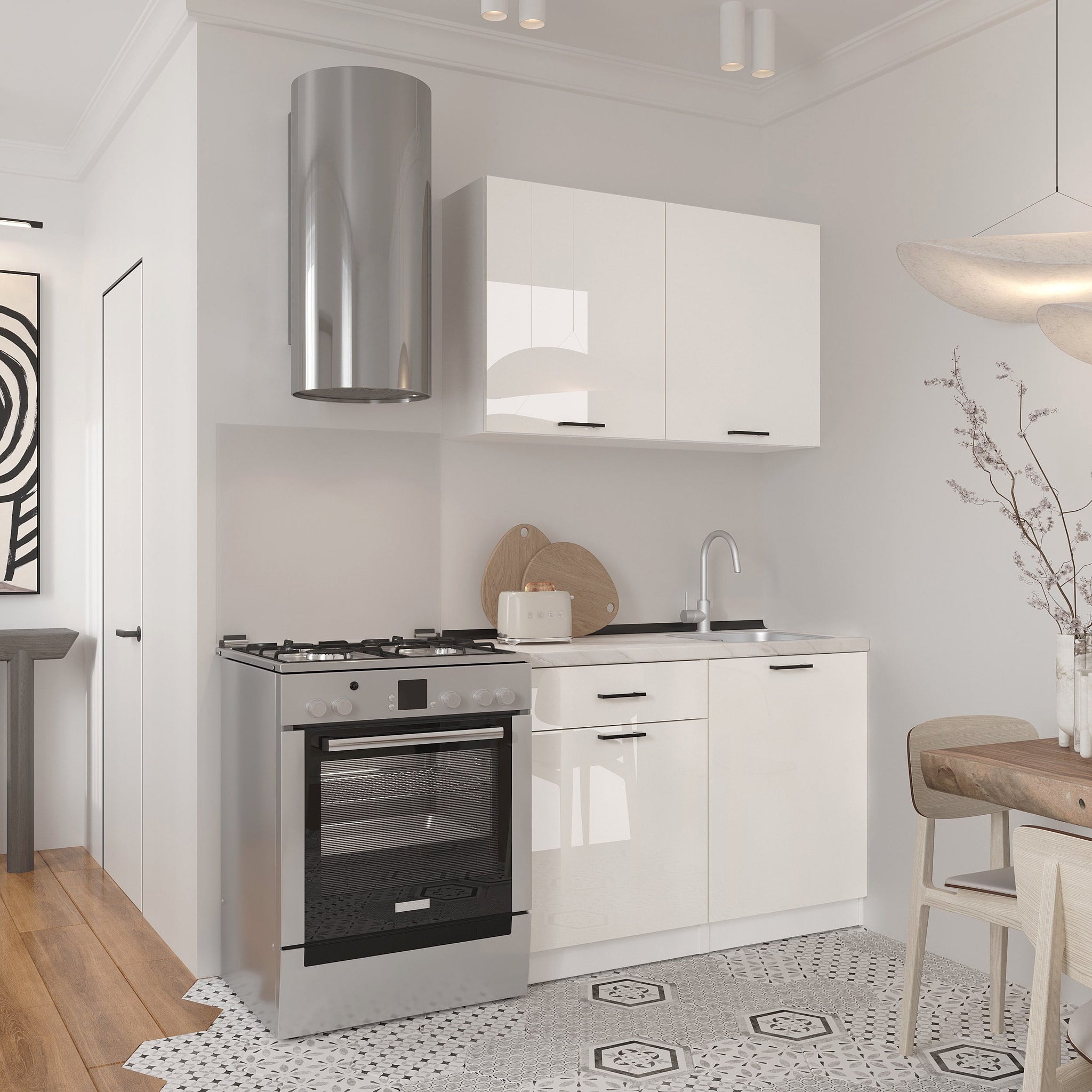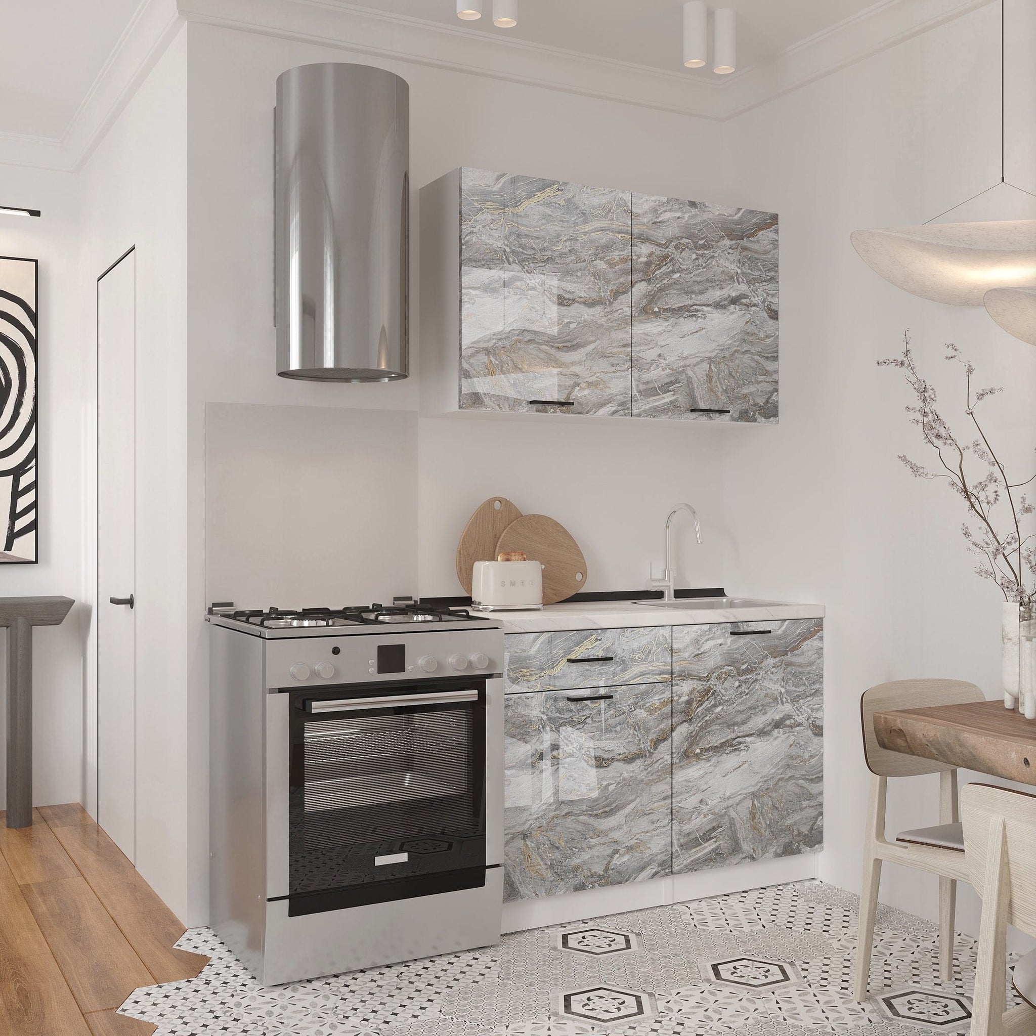Напольные и настенные шкафы с механизмами плавного закрывания, вместительные ящики и отделения для посуды, столовых приборов и кухонных принадлежностей. Материалы, не требующие особого ухода, идеально вписываются в интерьер.